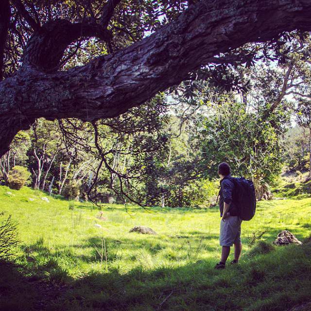 Hiking in the shadow of the archaic trees which line the coast at Matapaua Bay.