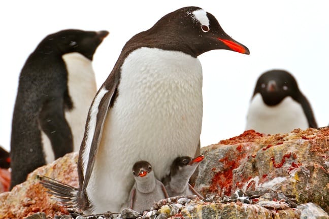 We were blessed with an incredibly rare sighting at the end of our visit to Antarctica’s Ardley Island. This mama Gentoo Penguin had two baby chicks (usually only one survives).